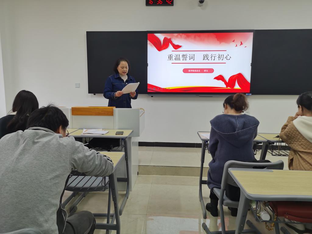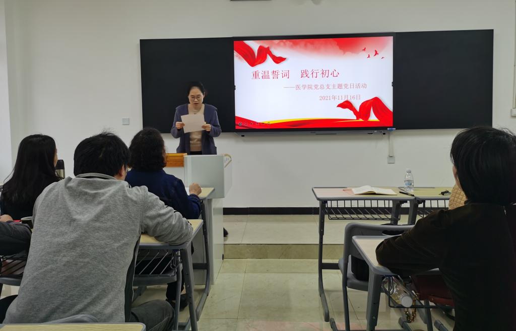为了激励全体党员坚守入党初心,保持自身的先进性和纯洁性,医学院党总支于11月16日下午在和济楼C113教室开展了“重温誓词,践行初心”主题党日活动。会议由党总支副书记王江南主持,全体党员参加。